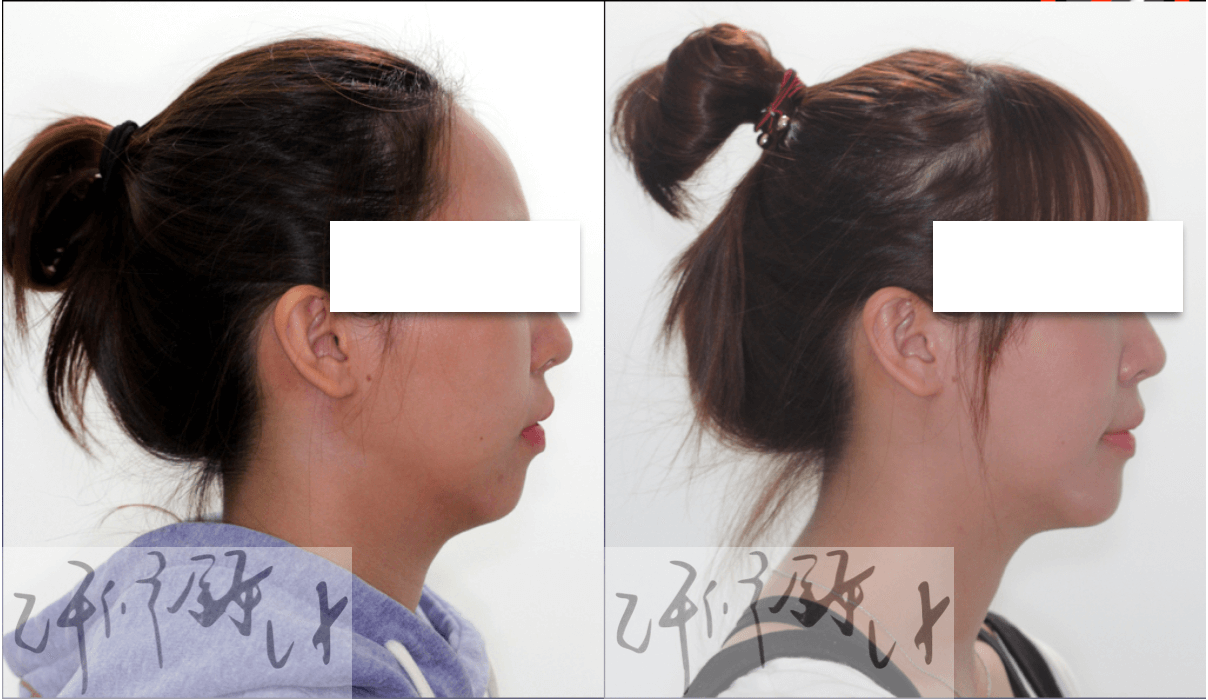 若是下頷發育不足,又同時合併咬合功能異常或是阻塞性睡眠呼吸中止症,則需採用正顎手術(orgthognathic surgery)才能獲得理想的治療效果。下面案例為下顎骨發育不足,導致雙唇無法自然閉攏且咬合功能異常。經正顎手術治療後,臉型及上下顎相對關係較為和諧、下臉部線條變的更立體,當然,下巴也更有男人味。