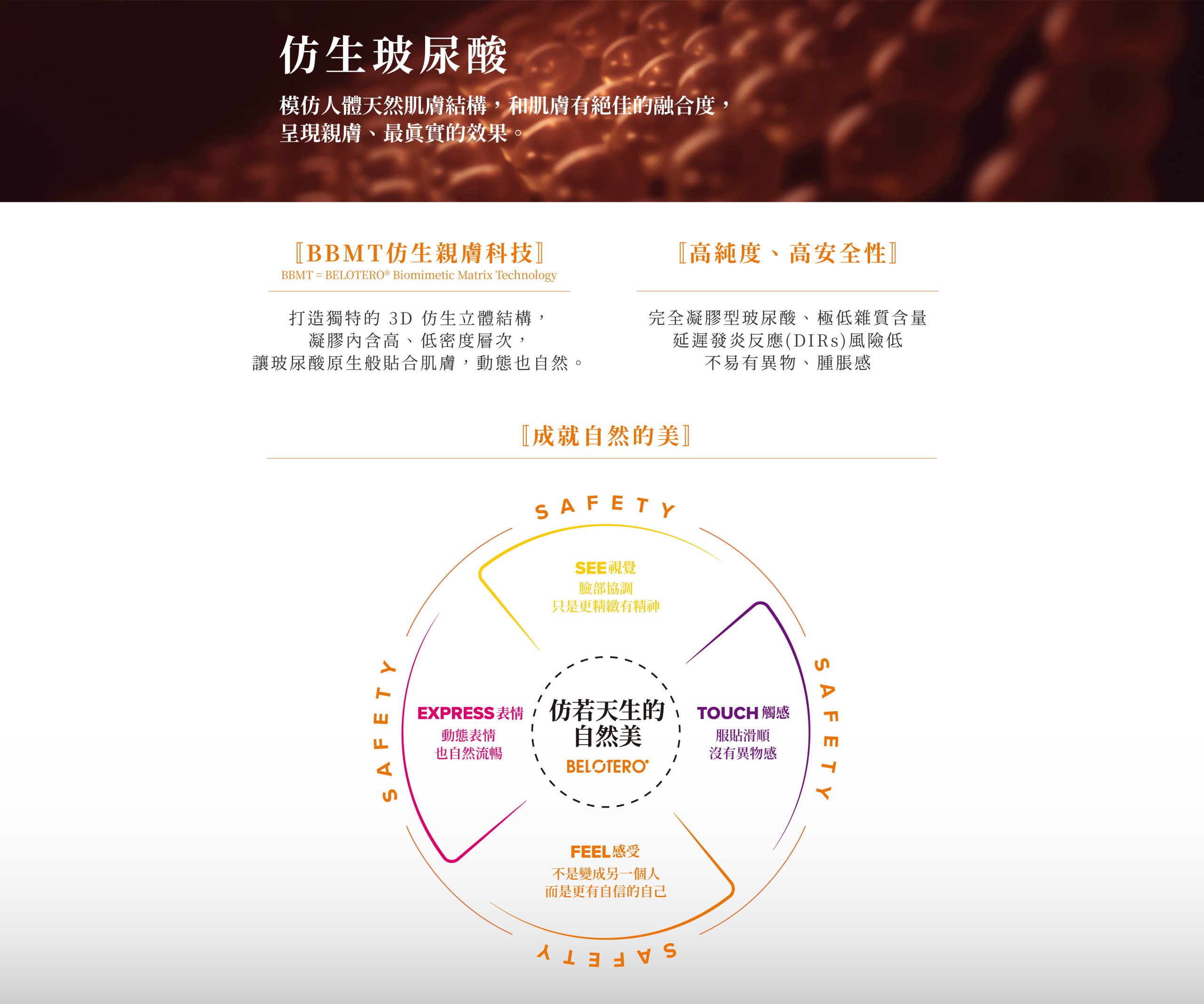 BELOTERO 保柔緹以「仿生」理念為核心,旨在模仿人體天然肌膚結構,強調與肌膚之間的自然協調表現,和肌膚有絕佳的融合度,呈現親膚、最真實的效果。