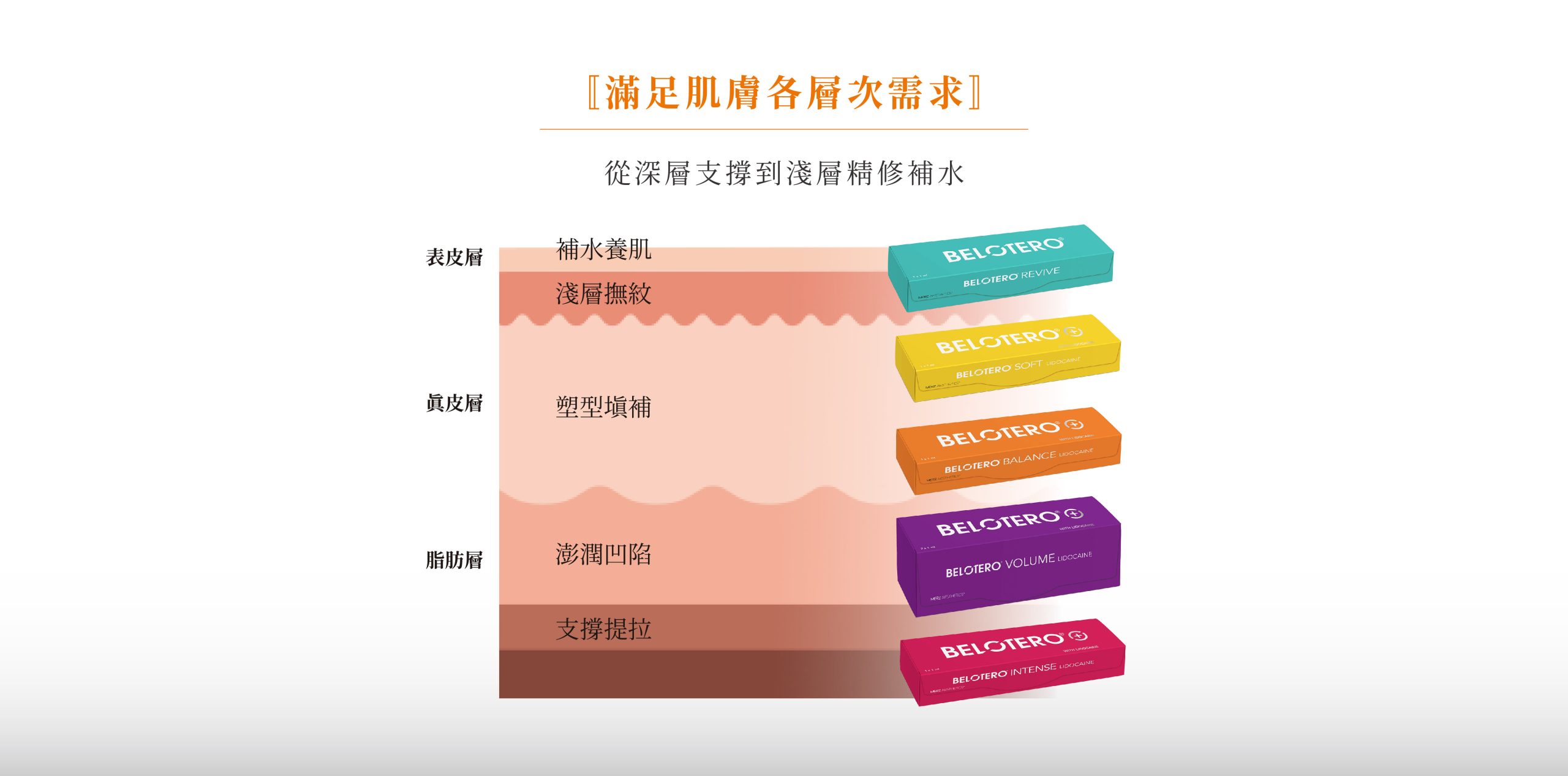 BELOTERO 保柔緹仿生玻尿酸各產品具不同流變特性,呈現不同質地,從深層支撐到淺層精修補水,都能滿足肌膚各層次不同的需求,客製化自然的美麗。