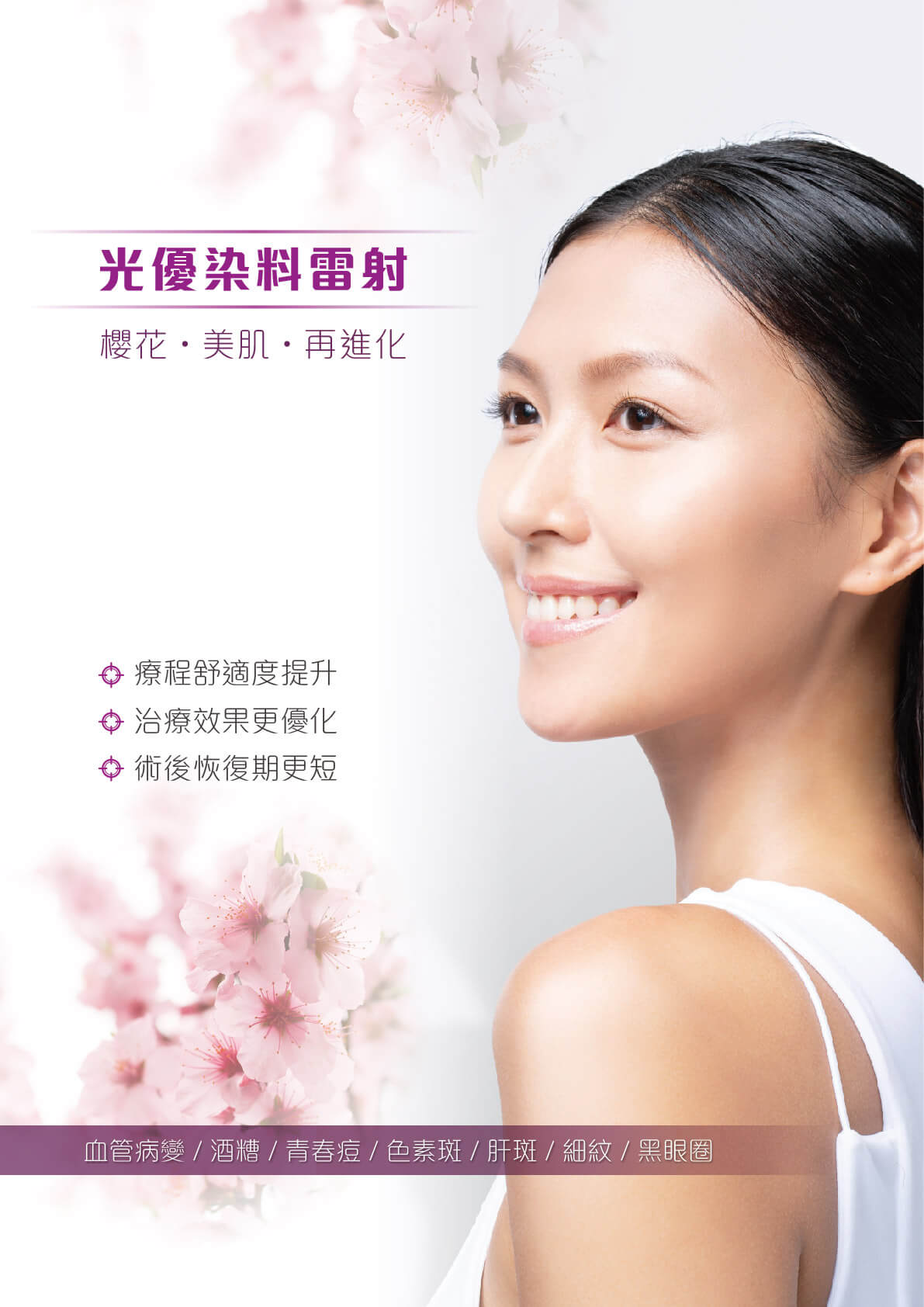臉部肌膚除了黑色素斑、細紋、鬆弛等常見老化徵狀,亦有不少血管病變問題,諸如發炎性青春痘、疤痕、血管絲、玫瑰斑、酒糟鼻及微血管擴張,甚至腿部靜脈曲張等,讓肌膚看起來「花花的」,因此可透過市面上俗稱「染料雷射」進行改善,重拾粉嫩氣色的好膚質。