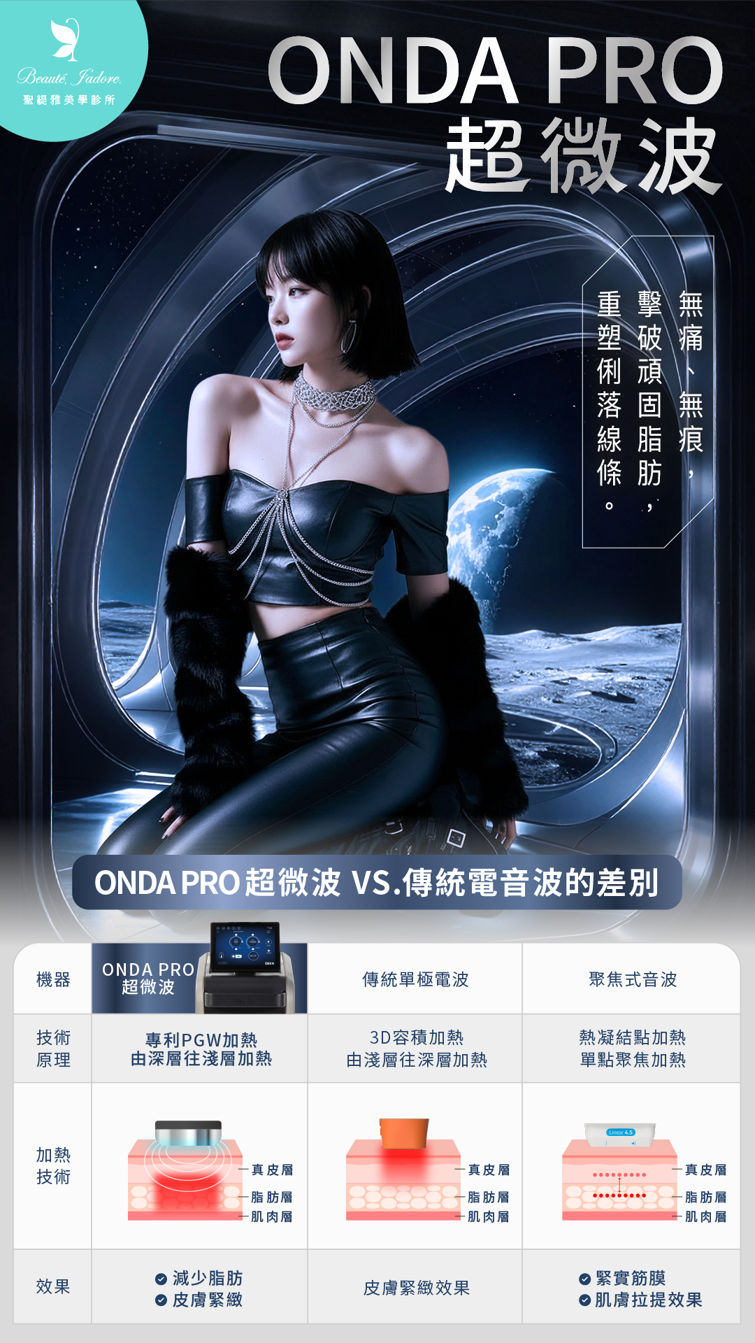 與一般 6MHz 電波相比,Onda Pro 的高頻微波能量更易穿透組織,近 80% 熱能聚焦脂肪層、20% 熱能作用真皮層,有效達到 深層消脂、淺層緊緻 的雙效美膚。治療同時降低表皮燙傷與灼熱感,舒適度提升,幾乎無修復期,讓變美可以無縫接軌日常生活。